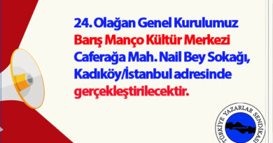 ÜYELERİMİZE GENEL KURUL DUYURUSU Türkiye Yazarlar Sendikası’nın 24. Olağan Genel Kurulu, 31 Mayıs 2025 tarihinde saat 12.00–17.00 arasında, Caferağa Mahallesi,Detay